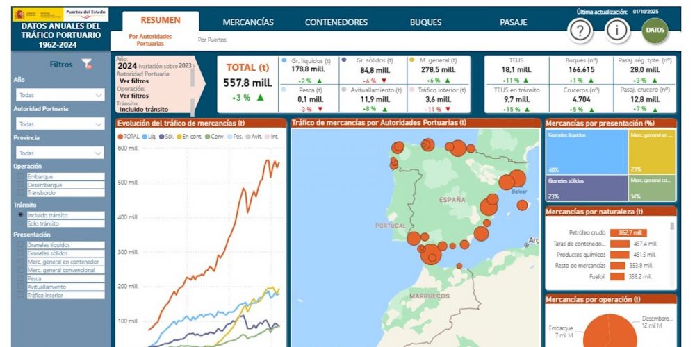 El documento recopila toda la información de los puertos españoles e incliuye una actualización del Cuadro de Mando de Datos Anuales 1962-2024, que permite acceder de forma interactiva a todos los datos de tráfico portuario y establecer comparativas.