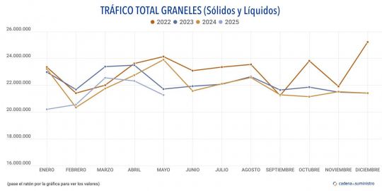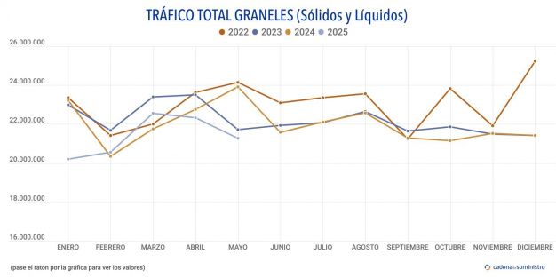 En los cinco primeros meses de 2025, el tráfico total de graneles líquidos suma 73.665.740 toneladas, un 4,4% anual menos, mientras que el de graneles sólidos alcanza las 35.013.188 toneladas, un 4,6% menos que hace un año.