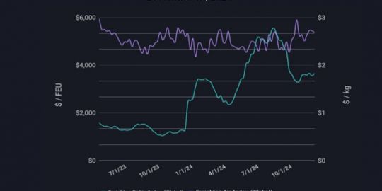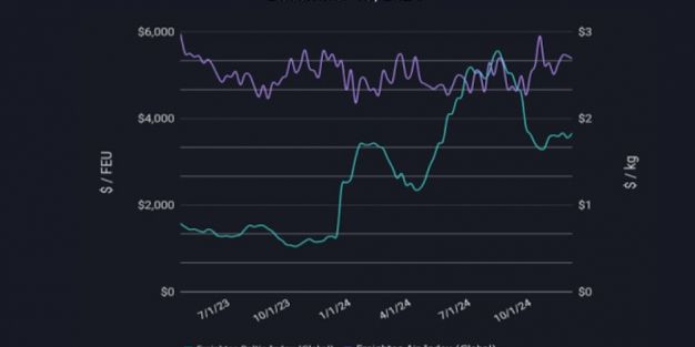 El crecimiento de la demanda, junto con el resto de condicionantes geopolíticos que afectan a los tráficos marítimos internacionales mantienen los fletes en niveles altos, especialmente en las rutas entre Asia y el Mediterráneo, que son superiores en todo caso a los que se registraban a finales de noviembre, e incluso un 40% por encima de los que había en octubre.