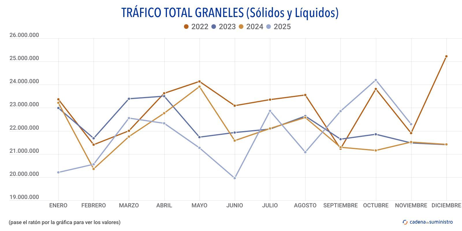 En los once primeros meses de 2025, el tráfico total de graneles líquidos suma 164.614.752 toneladas, un 0,3% anual más, mientras que el de graneles sólidos alcanza las 77.904.367 toneladas, un 3,5% menos que hace un año.