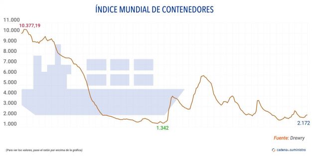 El Índice Mundial de Contenedores elaborado por Drewry, que evalúa las tasas de carga de contenedores en las ocho rutas principales hacia y desde Estados Unidos, Europa y Asia, ha aumentado un 2% en la última semana, situándose en los 2.172 dólares/FEU (1.876 euros).
