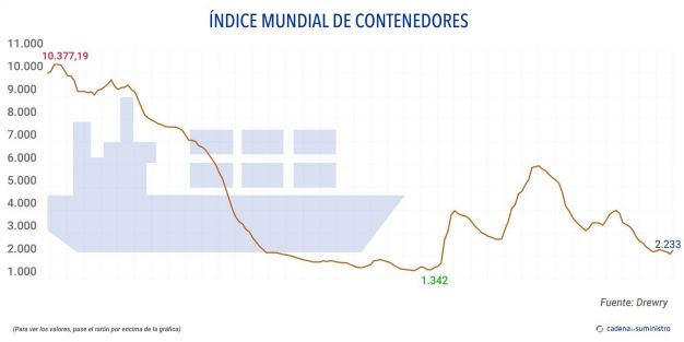 El Índice Mundial de Contenedores elaborado por Drewry, que evalúa las tasas de carga de contenedores en las ocho rutas principales hacia y desde Estados Unidos, Europa y Asia, se ha incrementado en un 8% en la última semana, situándose en los 2.233 dólares/FEU (1.922 euros).