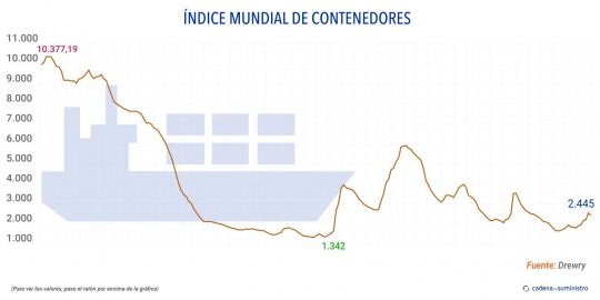 Tras el fuerte incremento de la primera semana del año, el Índice Mundial de Contenedores elaborado por Drewry, que evalúa las tasas de carga de contenedores en las ocho rutas principales hacia y desde Estados Unidos, Europa y Asia, ha anotado un descenso del 4% en la siguiente, situándose en los 2.445 dólares/FEU (2.106 euros).