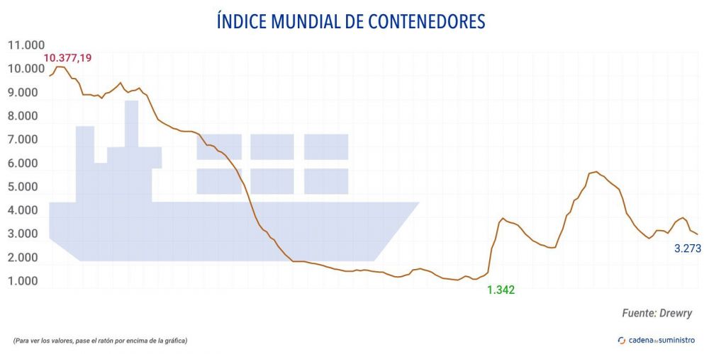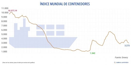 El Índice Mundial de Contenedores elaborado por Drewry, que evalúa las tasas de carga de contenedores en las ocho rutas principales hacia y desde Estados Unidos, Europa y Asia, se ha reducido en un 3% en la última semana, situándose en los 3.273 dólares/FEU (3.149 euros).