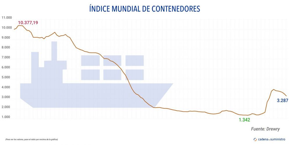 El Índice Mundial de Contenedores elaborado por Drewry, que evalúa las tasas de carga de contenedores en las ocho rutas principales hacia y desde Estados Unidos, Europa y Asia, se ha reducido en un 4% hasta los 3.162 dólares/FEU (2.902 euros).