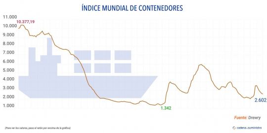 El Índice Mundial de Contenedores elaborado por Drewry, que evalúa las tasas de carga de contenedores en las ocho rutas principales hacia y desde Estados Unidos, Europa y Asia, se ha reducido un 2,6% en la última semana, situándose en los 2.602 dólares/FEU (2.238 euros).