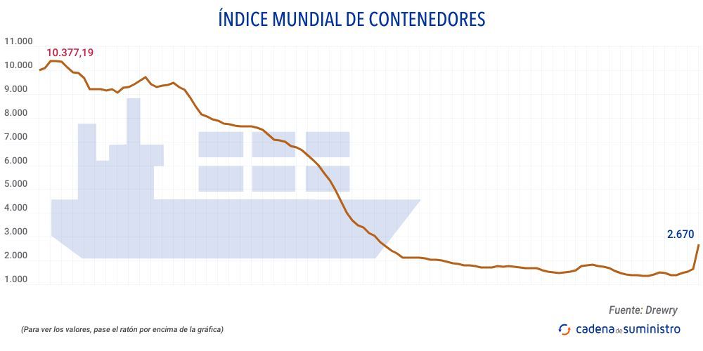 El Índice Mundial de Contenedores elaborado por Drewry, que evalúa las tasas de carga de contenedores en las ocho rutas principales hacia y desde Estados Unidos, Europa y Asia, se han incrementado un 61% hasta los 2.670 dólares/FEU (2.445 euros).