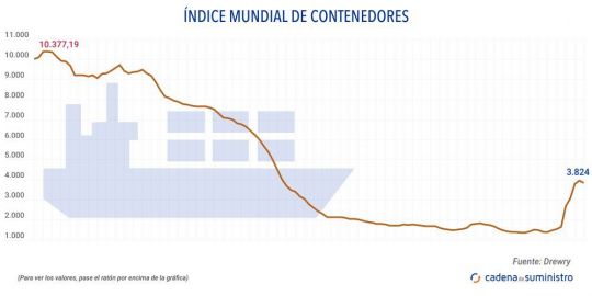 El Índice Mundial de Contenedores elaborado por Drewry, que evalúa las tasas de carga de contenedores en las ocho rutas principales hacia y desde Estados Unidos, Europa y Asia, se ha reducido en un 4% hasta los 3.824 dólares/FEU (3.513 euros).