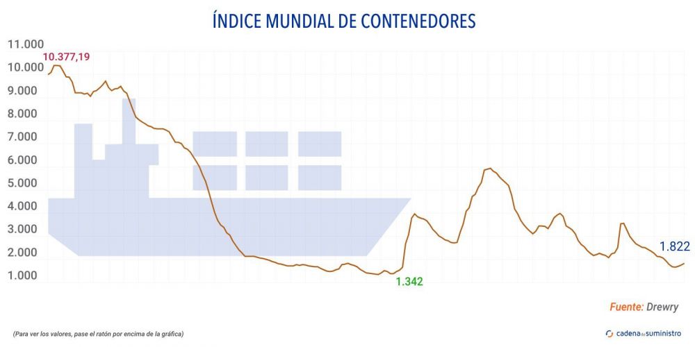 El Índice Mundial de Contenedores elaborado por Drewry, que evalúa las tasas de carga de contenedores en las ocho rutas principales hacia y desde Estados Unidos, Europa y Asia, se ha incrementado en un 4% en la última semana, situándose en los 1.822 dólares/FEU (1.576 euros).