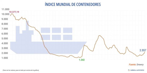 El Índice Mundial de Contenedores elaborado por Drewry, que evalúa las tasas de carga de contenedores en las ocho rutas principales hacia y desde Estados Unidos, Europa y Asia, se ha incrementado en un 16% en la primera semana de 2026, situándose en los 2.557 dólares/FEU (2.196 euros).