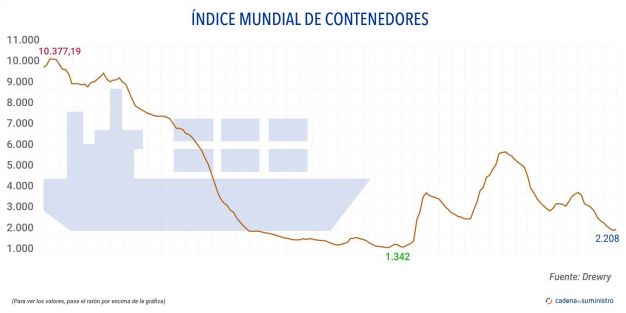 El Índice Mundial de Contenedores elaborado por Drewry, que evalúa las tasas de carga de contenedores en las ocho rutas principales hacia y desde Estados Unidos, Europa y Asia, se ha incrementado en un 2% en la última semana, situándose en los 2.208 dólares/FEU (1.996 euros). Se trata, por cierto, del primer aumento que se produce tras 11 semanas a la baja.