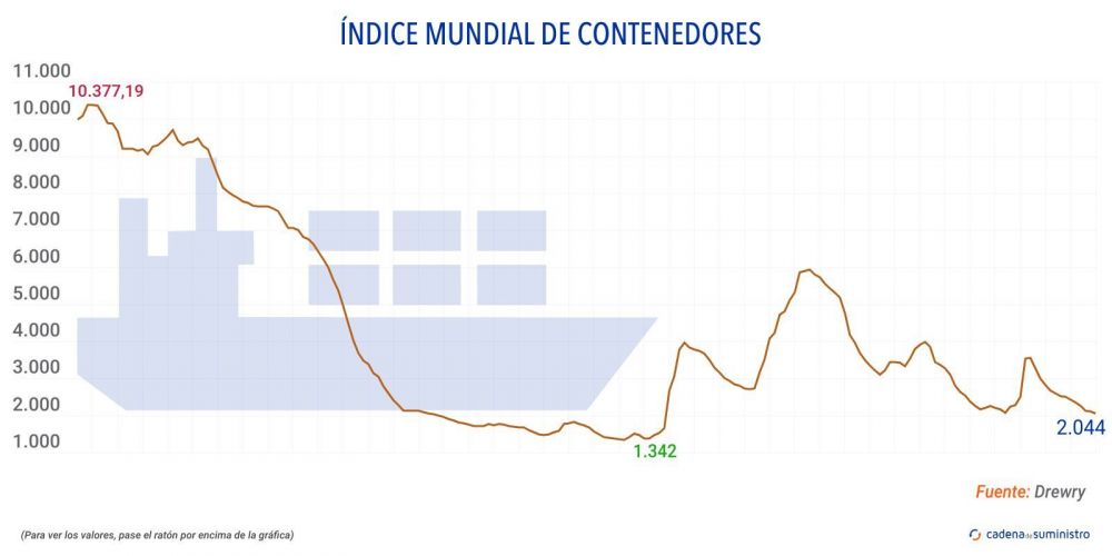 El Índice Mundial de Contenedores elaborado por Drewry, que evalúa las tasas de carga de contenedores en las ocho rutas principales hacia y desde Estados Unidos, Europa y Asia, se ha reducido un 3% en la última semana, situándose en los 2.044 dólares/FEU (1.741 euros).