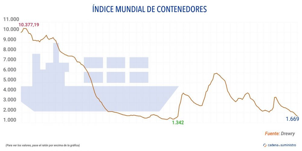 El índice, que suma ya 16 descensos consecutivos y se sitúa un 52% por debajo del nivel del año anterior, registra descensos tanto en las tasas de las rutas transpacíficas como en las de las conexiones entre Asia y Europa.