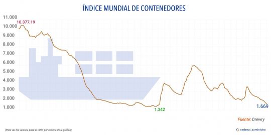El Índice Mundial de Contenedores elaborado por Drewry, que evalúa las tasas de carga de contenedores en las ocho rutas principales hacia y desde Estados Unidos, Europa y Asia, se ha reducido un 5% en la última semana, situándose en los 1.669 dólares/FEU (1.424 euros).