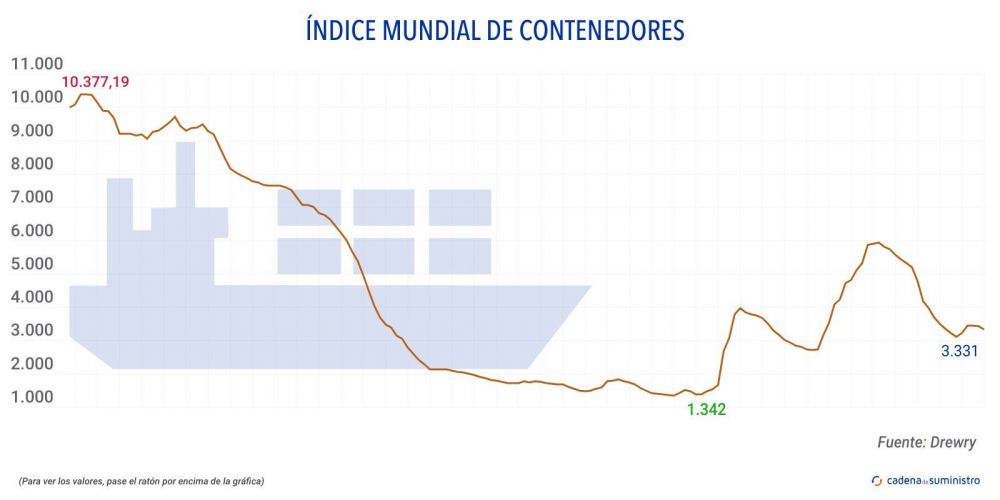 El Índice Mundial de Contenedores elaborado por Drewry, que evalúa las tasas de carga de contenedores en las ocho rutas principales hacia y desde Estados Unidos, Europa y Asia, se ha reducido un 2% en la última semana, situándose en los 3.331 dólares/FEU (3.154 euros).