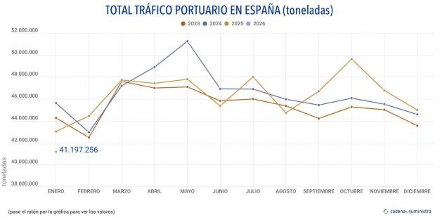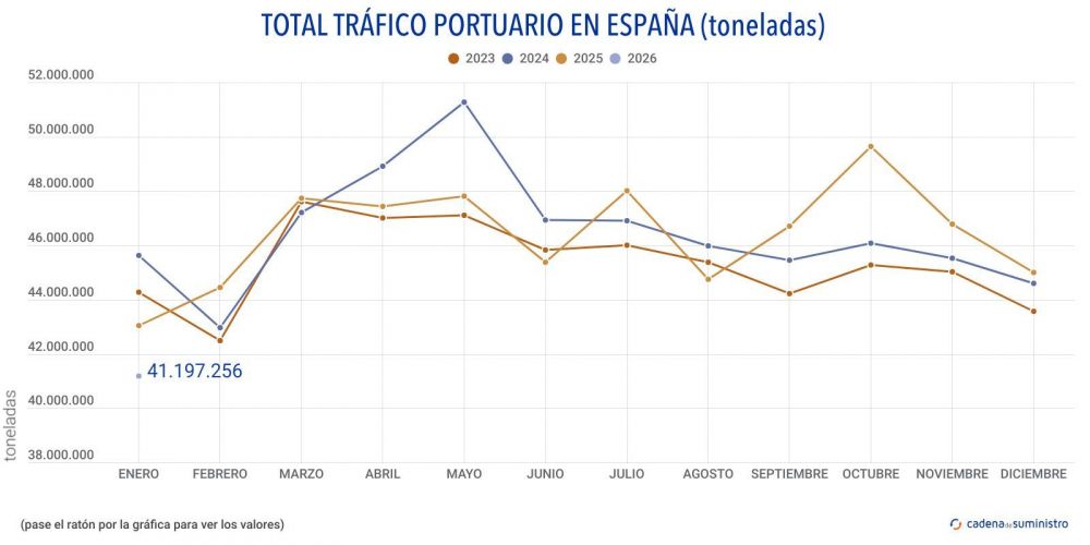 Los puertos españoles han movido en el mes de enero un total de 41.197.256 toneladas, un 4,5% menos que en el mismo mes de 2025, cuando se manipularon 43.132.947 toneladas.