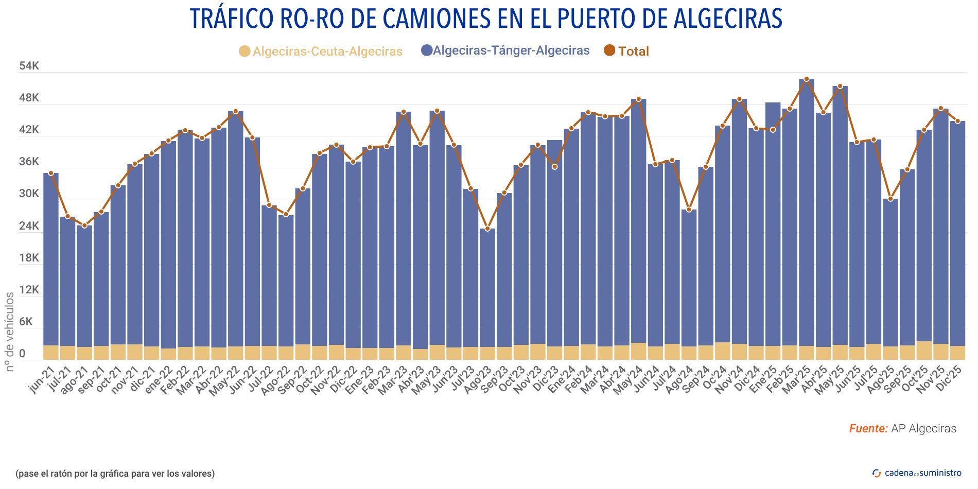 El tráfico de camiones que cruza el Estrecho de Gibraltar en las líneas que conectan el puerto de Algeciras con el norte de África se ha situado en 44.825 unidades en el último mes de 2025. Esto representa un incremento del 3,06% respecto a las 43.495 del mismo mes de 2024.