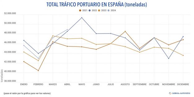 Así mismo, el tráfico ro-ro de abril llega a 6.402.180 toneladas, un 7,24% anual más, con 276.385 UTIs movidas en el mes. En lo que va de año, ha crecido un 2% hasta los 24,14 millones de toneladas, con 1.028.106 UTIs.