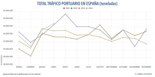 Además, el sistema portuario también registra un tráfico de mercancía general de 24.728.728 toneladas en el mes, con un ascenso con respecto a hace un año de un 11,14%. Entre enero y abril, la cifra asciende a 91,8 millones de toneladas, un 8,1% más que en 2023, destacando el crecimiento del 10,7% para la mercancía en contenedor, pero con un impulso también del 2,7% en la convencional.