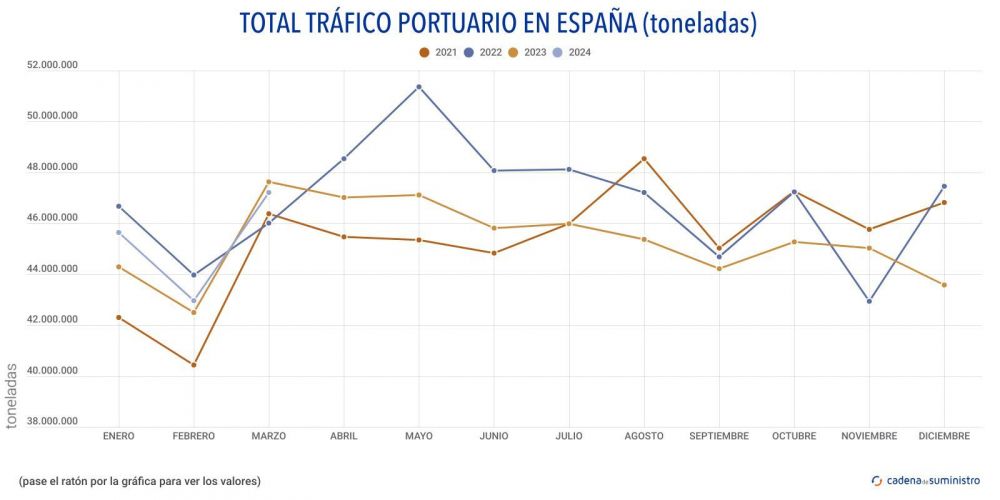 Los puertos españoles han movido en el mes de febrero un total de 47.201.848 toneladas, un 0,55% menos que en el mismo mes de 2023, cuando se manipularon 47.465.219 toneladas.
