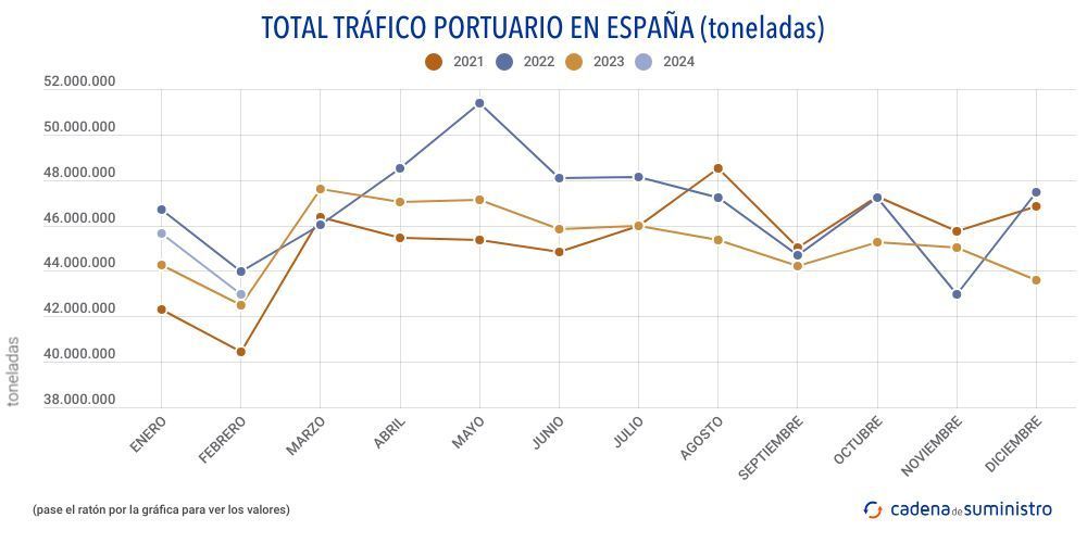 El tráfico acumulado en los dos primeros meses del ejercicio también presenta un incremento anual de un 2,4% para un volumen total en el período de 88.706.692 toneladas.