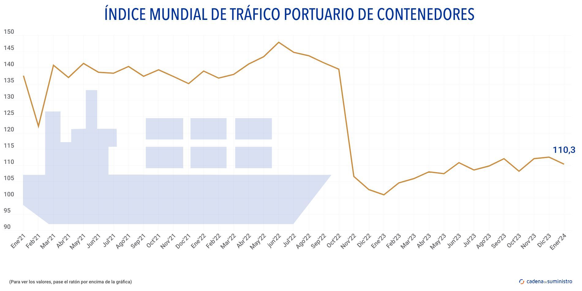 El Índice Mundial de Tráfico Portuario de Contenedores de Drewry retrocedió un 2% intermensual en enero, hasta los 110,3 puntos, una cifra que sin embargo se sitúa un 9,8% por encima del nivel del mismo mes del año anterior. Se prevé un descenso del 3,5% en las cifras de febrero de 2024, con un aumento del 5,5% interanual, según el modelo Nowcasting de la consultora.