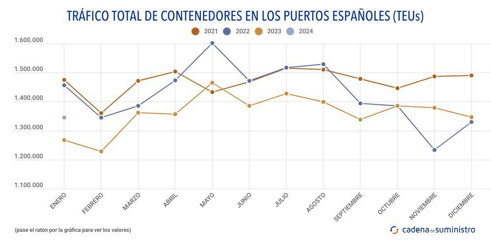 En detalle, 739.886 TEUs corresponden a contenedores en tránsito, un 13,2% anual más, mientras que 160.688 TEUs corresponden a entradas y salidas nacionales, un 0,5% más que en enero de 2023, y 444.281 TEUs a import-export exterior, lo que se traduce en un descenso anual de un 3%.