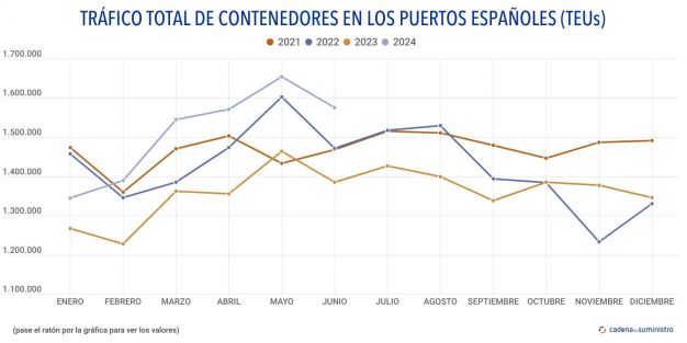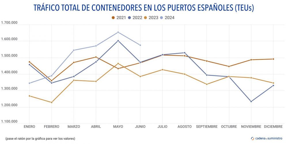 En los seis primeros meses del año, los puertos españoles han movido 9.095.543 TEUs, un 12,4% más que en el mismo período de 2023.