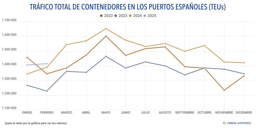 En detalle, 708.679 TEUs corresponden a contenedores en tránsito, un 2,43% anual menos, mientras que 173.724 TEUs corresponden a entradas y salidas nacionales, un 3,26% más que en febrero de 2024, y 532.234 TEUs a import-export exterior, lo que se traduce en un ascenso anual de un 8,9%.