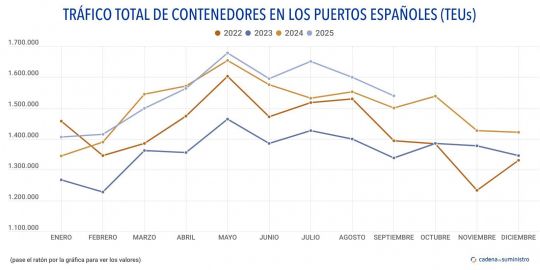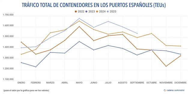 En detalle, 804.258 TEUs corresponden a contenedores en tránsito, un 2,59% anual más, mientras que 169.624 TEUs corresponden a entradas y salidas nacionales, un 2,56% más que en septiembre de 2024, y 565.099 TEUs a import-export exterior, lo que se traduce en un ascenso anual de un 2,1%.