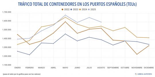 En detalle, 845.529 TEUs corresponden a contenedores en tránsito, un 3,27% anual más, mientras que 181.099 TEUs corresponden a entradas y salidas nacionales, un 2,99% más que en agosto de 2024, y 573.124 TEUs a import-export exterior, lo que se traduce en un ascenso anual de un 4,55%.