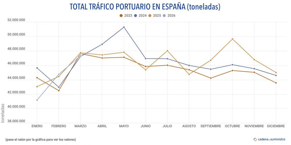 Además, el sistema portuario también registra un tráfico de mercancía general de 24.564.599 toneladas en el período, con un ascenso con respecto al tercer mes de 2025 de un 2,43%.