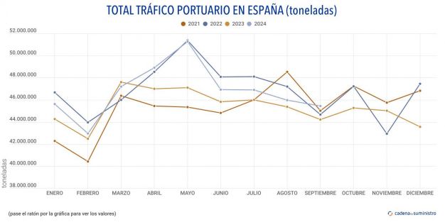Además, el sistema portuario también registra un tráfico de mercancía general de 22.942.428 toneladas en el mes, con un ascenso con respecto a hace un año de un 7,07%.