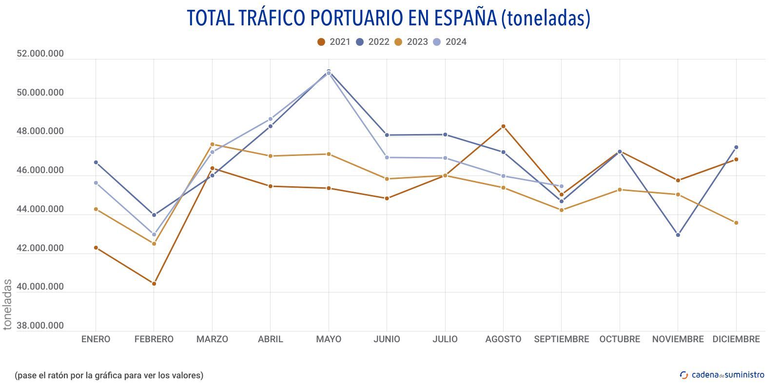 Los puertos españoles han movido en el mes de septiembre un total de 45.455.060 toneladas, un 3,16% más que en el mismo mes de 2023, cuando se manipularon 44.061.362 toneladas.