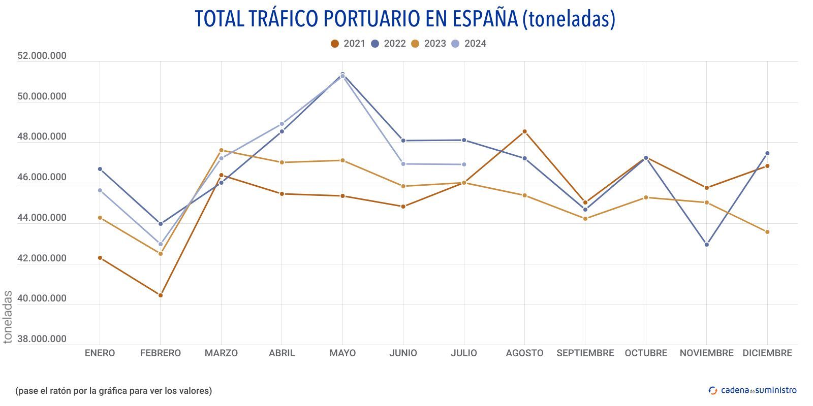 El tráfico acumulado en los siete primeros meses del ejercicio también presenta un incremento anual de un 3% para un volumen total en el período de 330.322.598 toneladas.