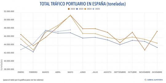 Además, el sistema portuario también registra un tráfico de mercancía general de 25.301.054 toneladas en el período, con un descenso con respecto al mismo mes de 2024 de un 2,85%.