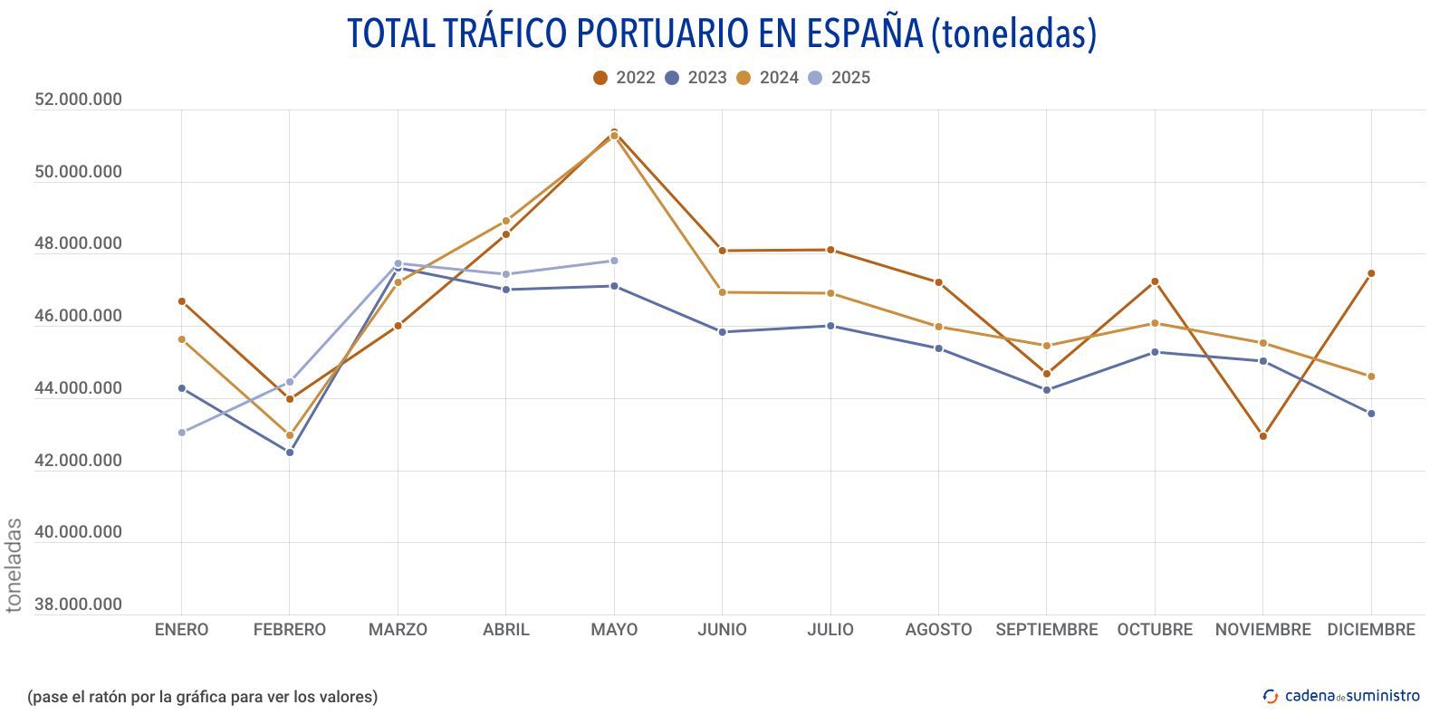 En los cinco primeros meses de 2025, el tráfico portuario total asciende a 229.969.823 toneladas de mercancías, lo que supone un descenso anual de un 2,9%.