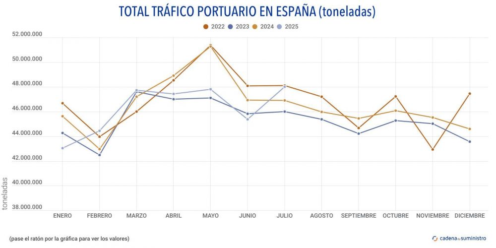 De enero a julio de 2025, el tráfico portuario total asciende a 323.853.685 toneladas de mercancías, lo que supone un descenso anual de un 2,3%.
