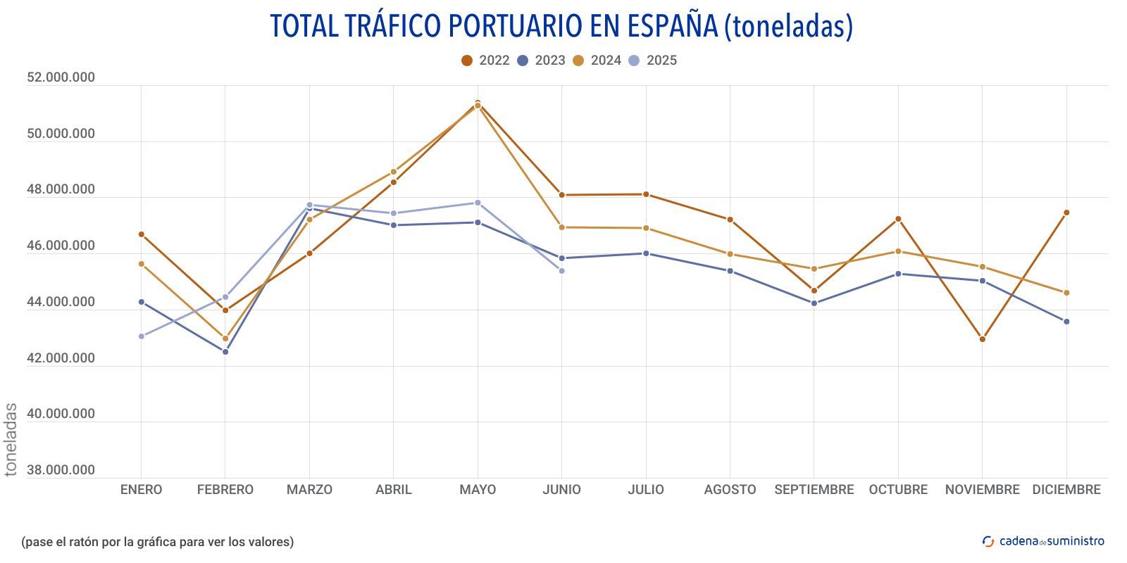 Además, el sistema portuario también registra un tráfico de mercancía general de 24.174960 toneladas en el período, con un ligero ascenso con respecto al mismo mes de 2024 de un 0,14%.