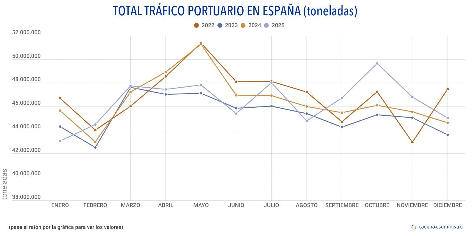 Además, el sistema portuario también registra un tráfico de mercancía general de 21.408.778 toneladas en el período, con un descenso con respecto al mismo mes de 2024 de un 1,83%.