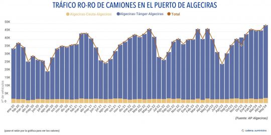 Desde principios de año, el tráfico de camiones se ha situado en 230.497 unidades, lo que representa un ascenso del 7,63%. La conexión Algeciras-Tánger Med acumula ya un total de 216.366 unidades, un 7,22% más, y la de Algeciras-Ceuta alcanza las 13.941 unidades, que representan un crecimiento del 15,8%, mientras que entre Algeciras y otros puertos se han movido 190 unidades, un 42,6% menos.
