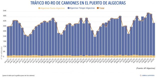 En lo que va de año, el tráfico de camiones se ha situado en 284.391 unidades, lo que representa un ascenso del 6,41%. La conexión Algeciras-Tánger Med acumula ya un total de 268.782 unidades, un 7,27% más, y la de Algeciras-Ceuta ha alcanzado las 15.532 unidades, que representan una caída del 5,8%.
