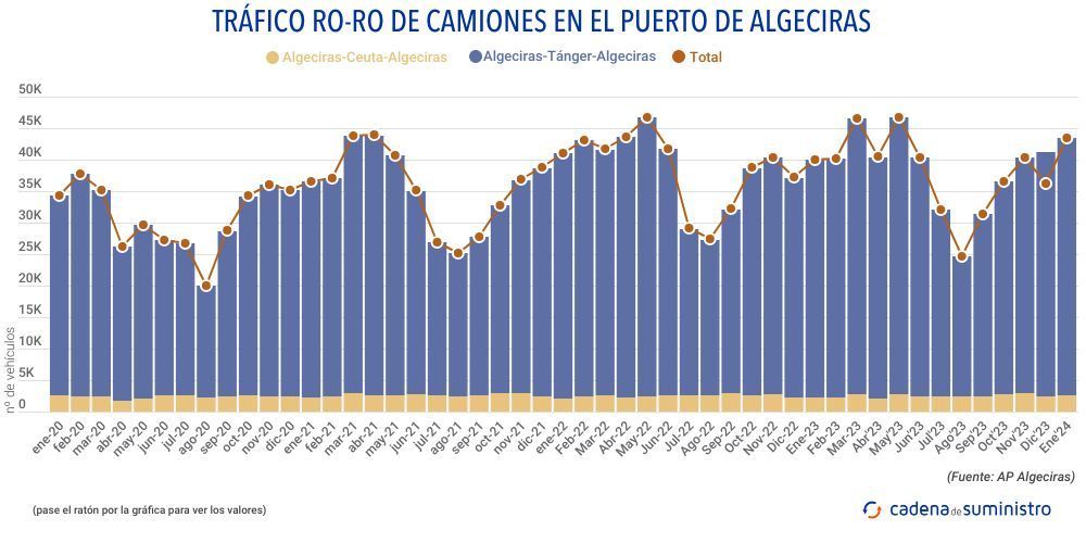 El número de camiones que cruza el Estrecho de Gibraltar en las líneas que conectan el puerto de Algeciras con el norte de África se ha situado en 43.453 en el primer mes de 2024. Esto representa un 8,64% más que los 39.998 con los que se inició 2023.