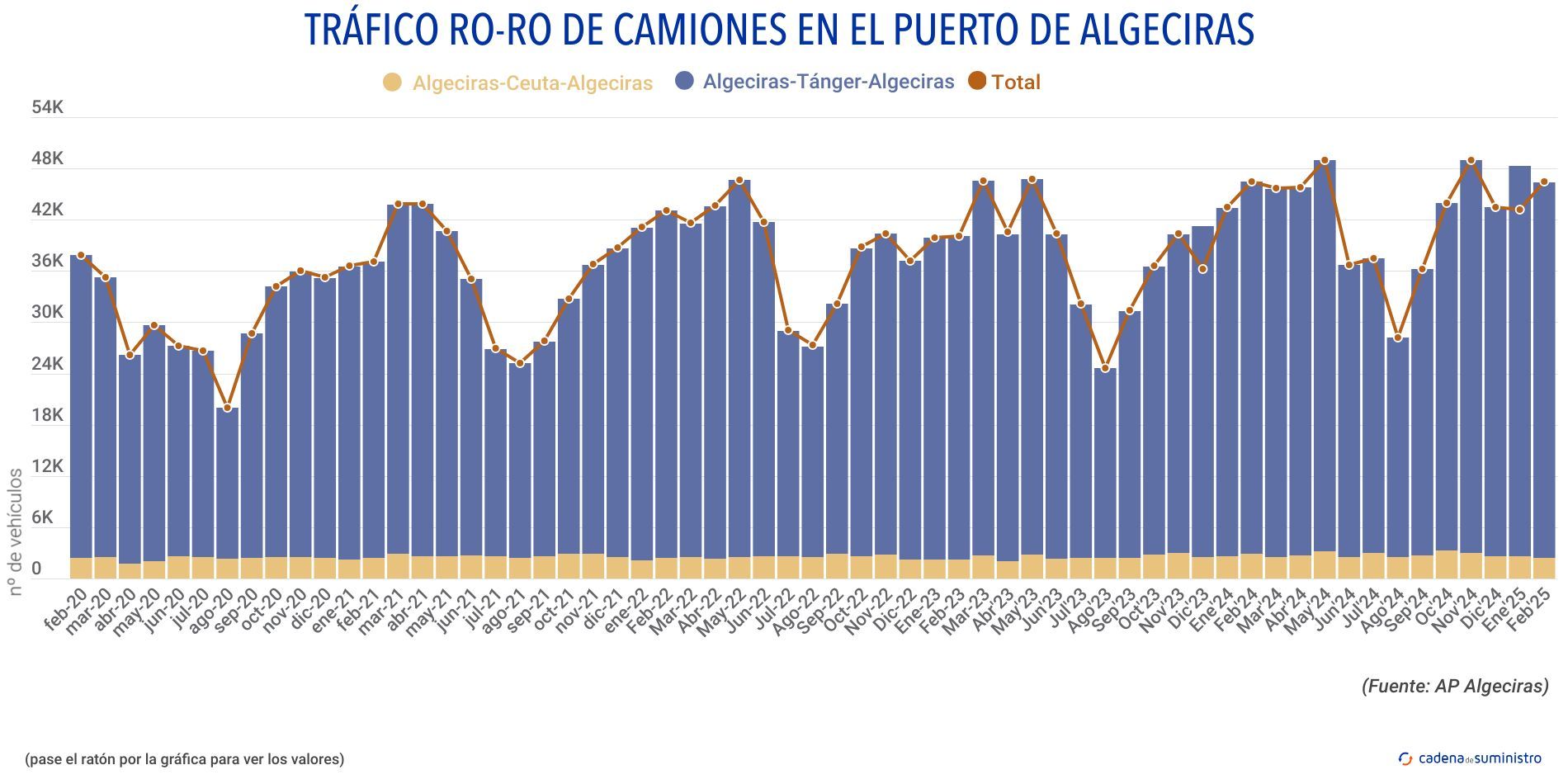 El número de camiones que cruza el Estrecho de Gibraltar en las líneas que conectan el puerto de Algeciras con el norte de África se ha situado en 46.424 en el cuarto mes de 2025. Esto representa un 1,32% más que los 45.818 del mismo mes de 2024.