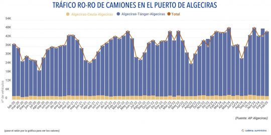 En lo que va de año, el tráfico de camiones se ha situado en 192.073 unidades, lo que representa un ascenso del 5,81%. La conexión Algeciras-Tánger Med acumula ya un total de 181.714 unidades, un 6,51% más, y la de Algeciras-Ceuta ha alcanzado las 10.305 unidades, que representan una caída del 4,31%.