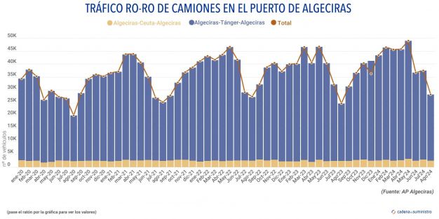 Desde principios de año, el tráfico de camiones se ha situado en 332.887 unidades, lo que representa un ascenso del 6,91%. La conexión Algeciras-Tánger Med acumula ya un total de 310.657 unidades, un 6,48% más, y la de Algeciras-Ceuta ha alcanzado las 21.976 unidades, que representan un crecimiento del 14,46%, mientras que entre Algeciras y otros puertos se han movido 254 unidades, un 37,44% menos.