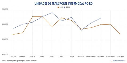 De igual modo, en el mes se han registrado un total de 273.132 unidades de transporte intermodal ro-ro, un 8,7% más que en idéntico período de un año antes.