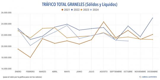 En consecuencia, los acumulados en los diez primeros meses del ejercicio suman 150.052.260 toneladas de graneles líquidos, con un ascenso anual de un 2,9%, y 70.917.349 toneladas de graneles sólidos, un 7,4% menos que hace un año.