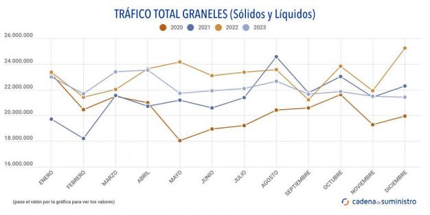 En todo 2023, el sistema portuario del país totaliza 175.064.398 toneladas de graneles líquidos, un 3,7% menos que hace un año, y 90.448.050 toneladas de graneles sólidos, un 3,7% anual menos.