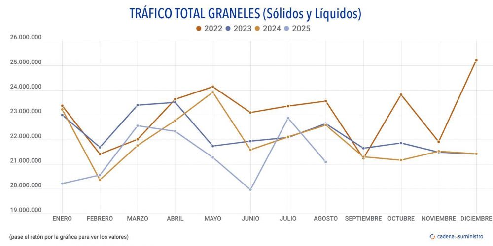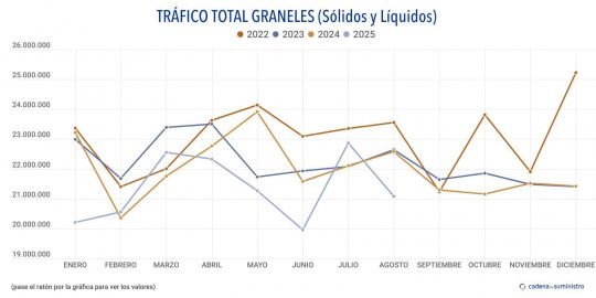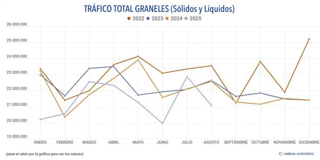 En los ocho primeros meses de 2025, el tráfico total de graneles líquidos suma 118.178.285 toneladas, un 3,1% anual menos, mientras que el de graneles sólidos alcanza las 52.342.329 toneladas, un 6,6% menos que hace un año.